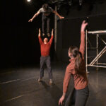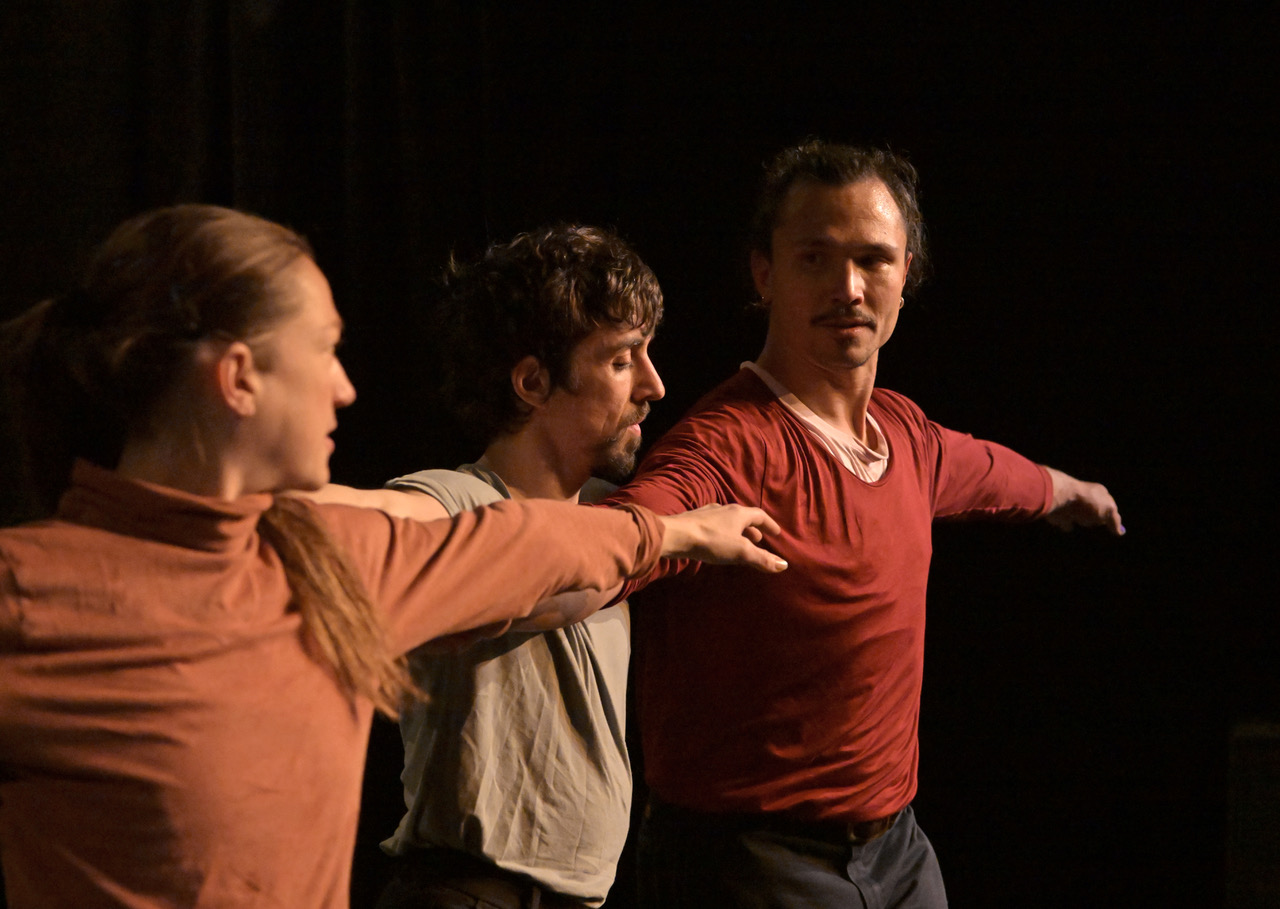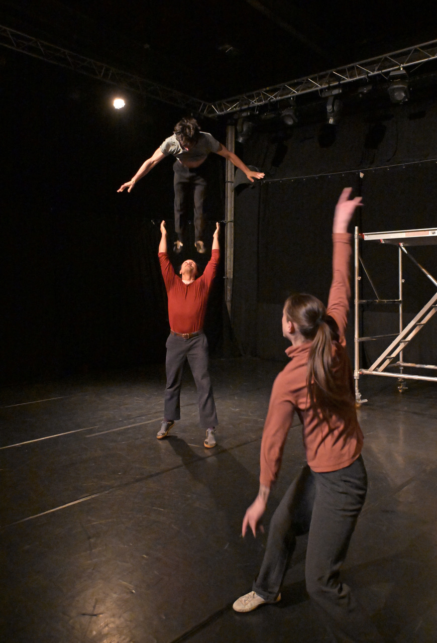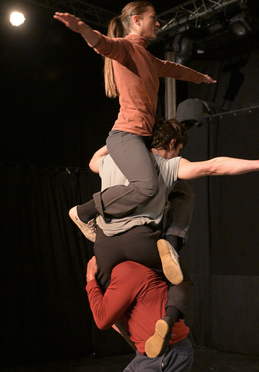 Drei Performer. Ein Gerüst, kaum sichtbar. Die Schichten verschieben sich, weiten und verdichten sich. Reibung an der Haut, Vertrauen im Griff, das Wagnis des Loslassens. Was hält uns? Was trägt uns? Was umgibt Sie?
